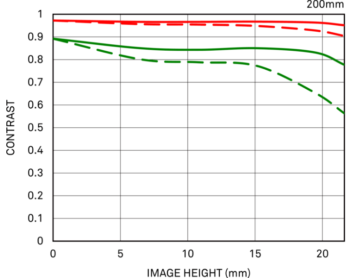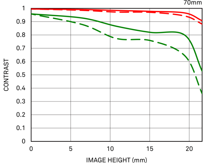 MTF (Modulation Transfer Function – Hàm Truyền Tải Điều Chế) là một trong những phép đo để đánh giá hiệu suất của ống kính, và nó cho thấy mức độ trung thực mà độ tương phản của chủ thể có thể được tái tạo trên mặt phẳng ảnh. Trục ngang thể hiện chiều cao ảnh (khoảng cách từ tâm ảnh tính bằng mm) và trục dọc thể hiện giá trị độ tương phản (giá trị tối đa là 1).