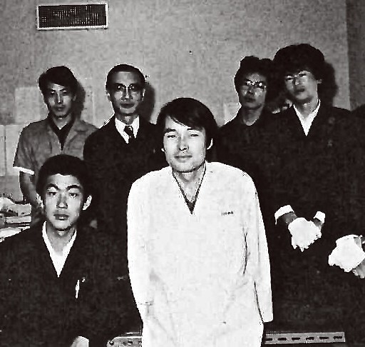 Chụp cùng các đồng nghiệp (đứng giữa) tại nhà máy Aizu khi ông ở độ tuổi 20.