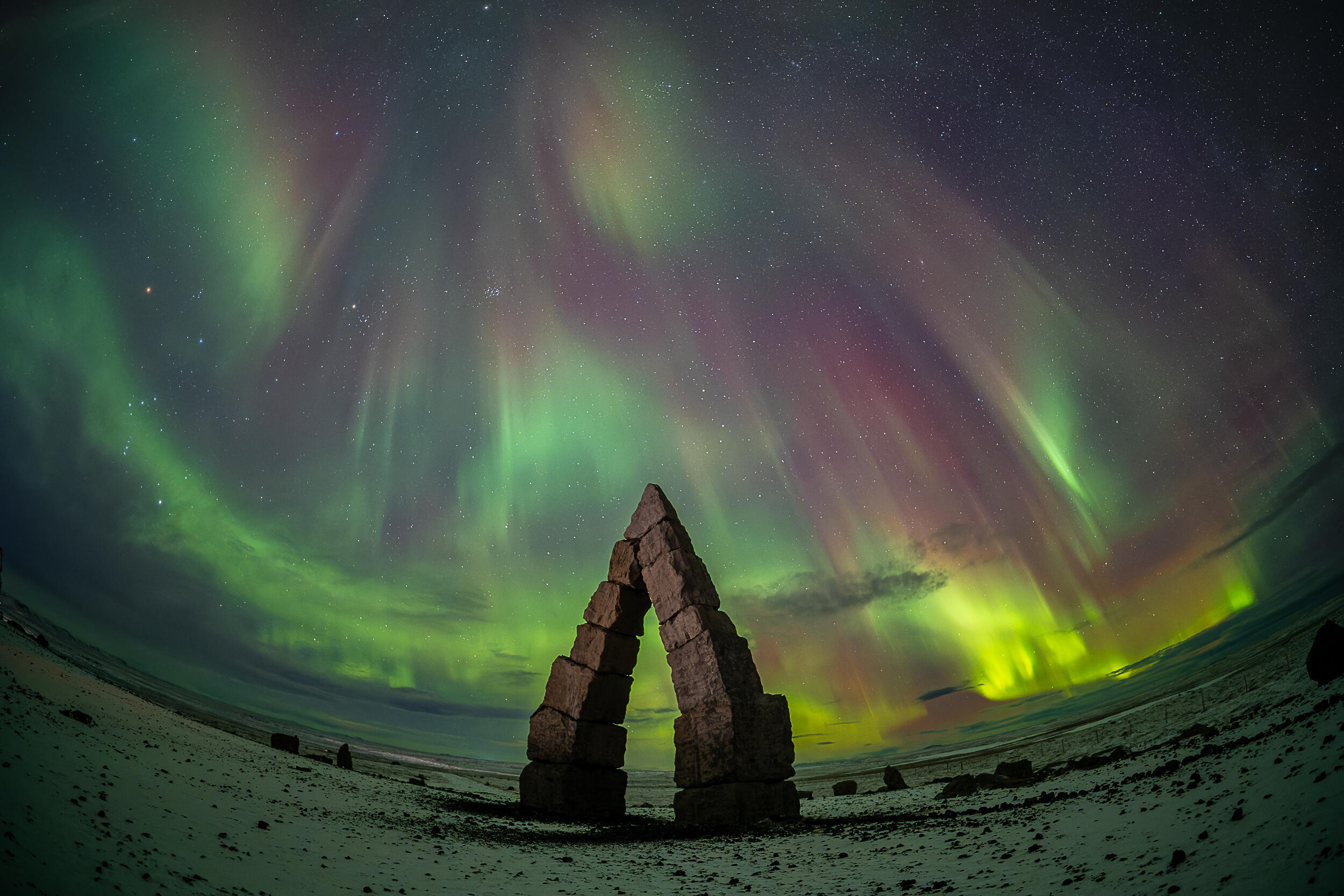 Iceland vào mùa đông có thể là một nơi đầy thách thức. Trong suốt một tuần lưu lại, tôi chỉ có hai đêm trời quang đãng để chụp thiên văn. Các dự báo thời tiết thật tàn nhẫn; nếu muốn bầu trời trong xanh, bạn phải đi đến tận cùng phía đông của hòn đảo sau khi hạ cánh xuống Reykjavik. Tôi thực sự rất vui vì tôi sẽ đi xuyên qua toàn bộ bề ngang của Iceland vào mùa đông—một cuộc phiêu lưu thực sự. Đồng thời, tôi sẽ đến được một nơi mà tôi đã không ghé thăm trong một thời gian dài và dường như hoàn hảo cho loại ống kính này: những vòm đá hoành tráng của Arctic Henge.